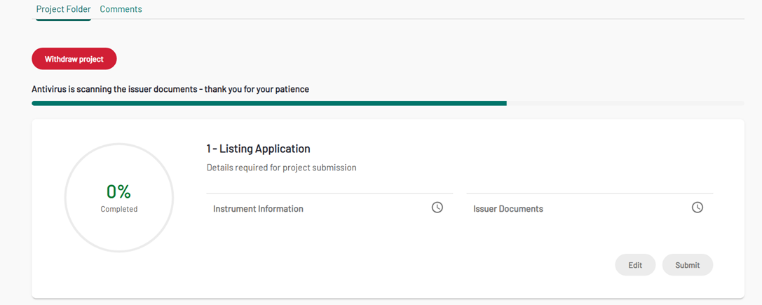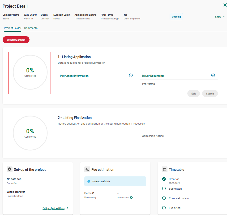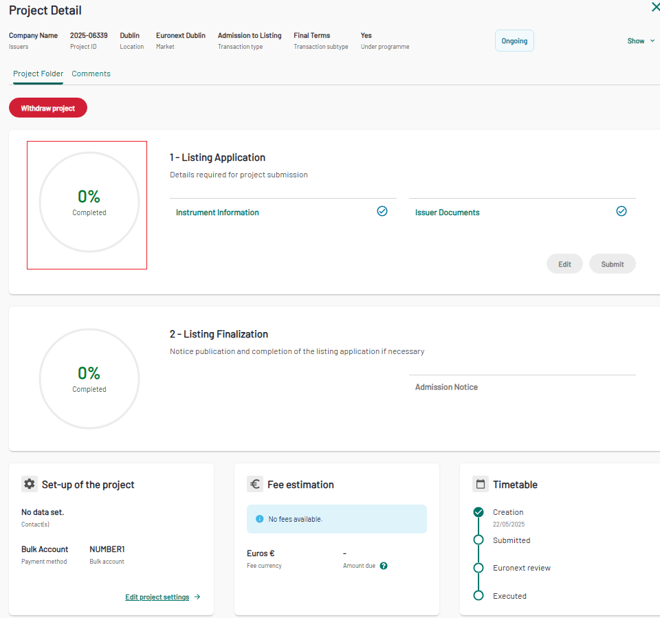 The Project folder is the dashboard of the listing application. From here, you can access the Instrument Information form and Issuer Document section. You can monitor the progress of your project up to the availability of the related market notice by checking the completion percentage.