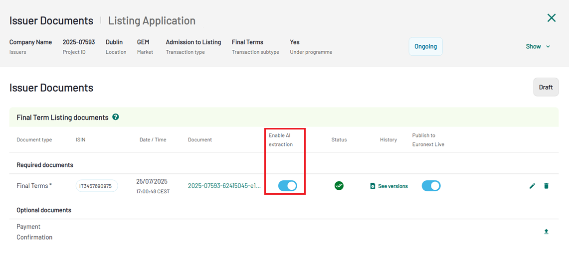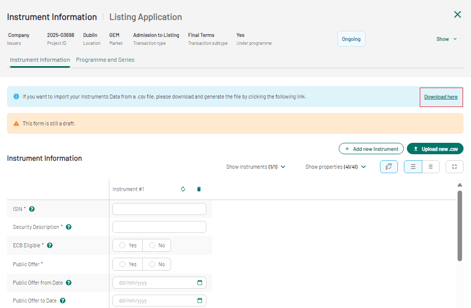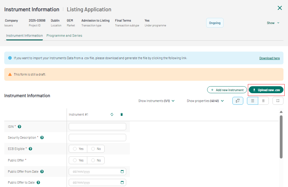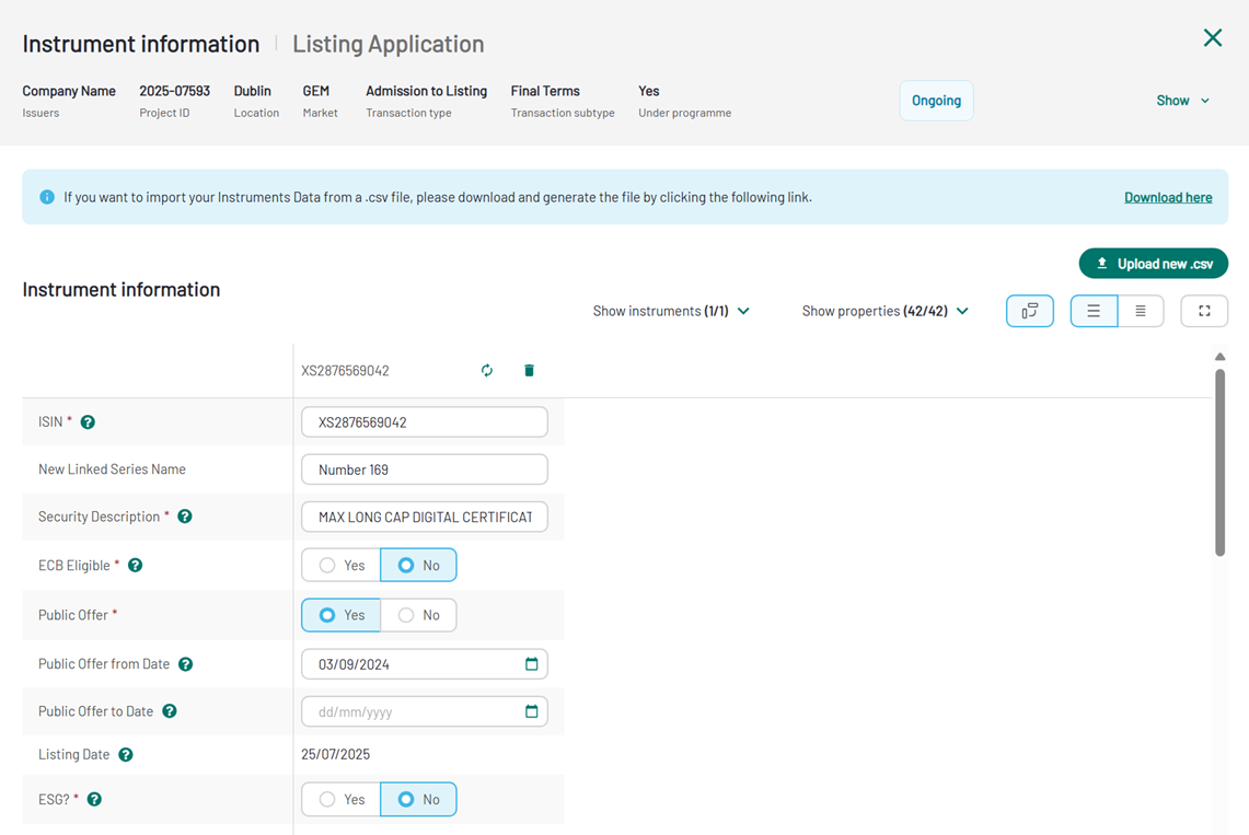 When the extraction is completed, the Instrument Information form will be prefilled, based on the information available in the Final terms document. The manual fill-in option, and the upload option are available anyway.