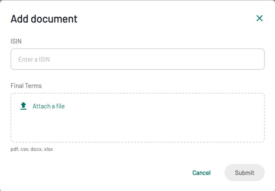 To upload a Final Terms, click on the “upload arrow”” available next to the document type in the Issuer document section. The final term upload box will appear.