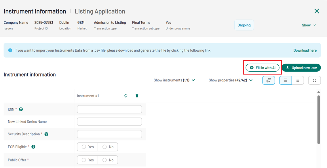 Click the “Instrument Information” link in the project folder to enter the general information about the listing. On the top right corner "Fill with AI" button is available, click on it to be redirected to the Issuer Document section.