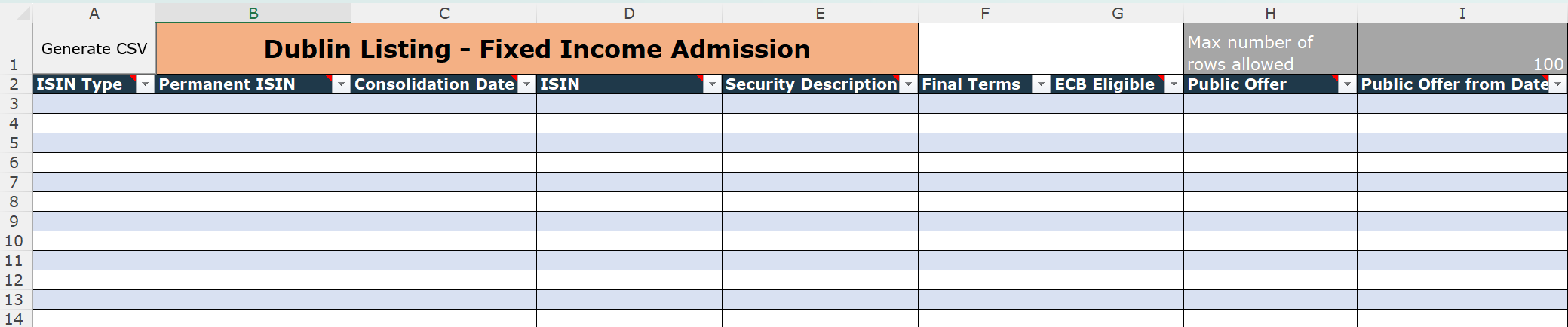 Open the downloaded file and start filling it in. You can type the values manually or use the dropdown list of values, when available. Once the file is completed, click on "Generate CSV" to save this version of the file, ready to be uploaded on the application.