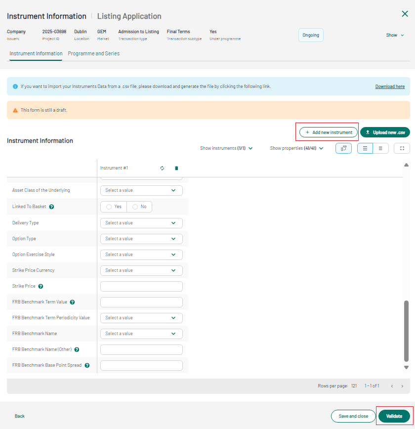 To fill-in the form manually, you can start typing field by field. To add new column, click on the "Add new Instrument" button. The column headers will be labelled will be added. The column header will be named as "Instrument#1". A single Final Terms project should only include ‘Instrument#1’ and multi-Final terms project can include multiple instruments. To permanently delete an Instrument, click on the dustbin.