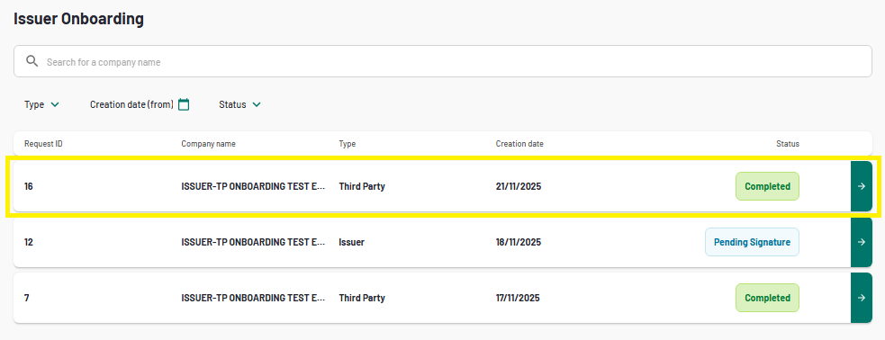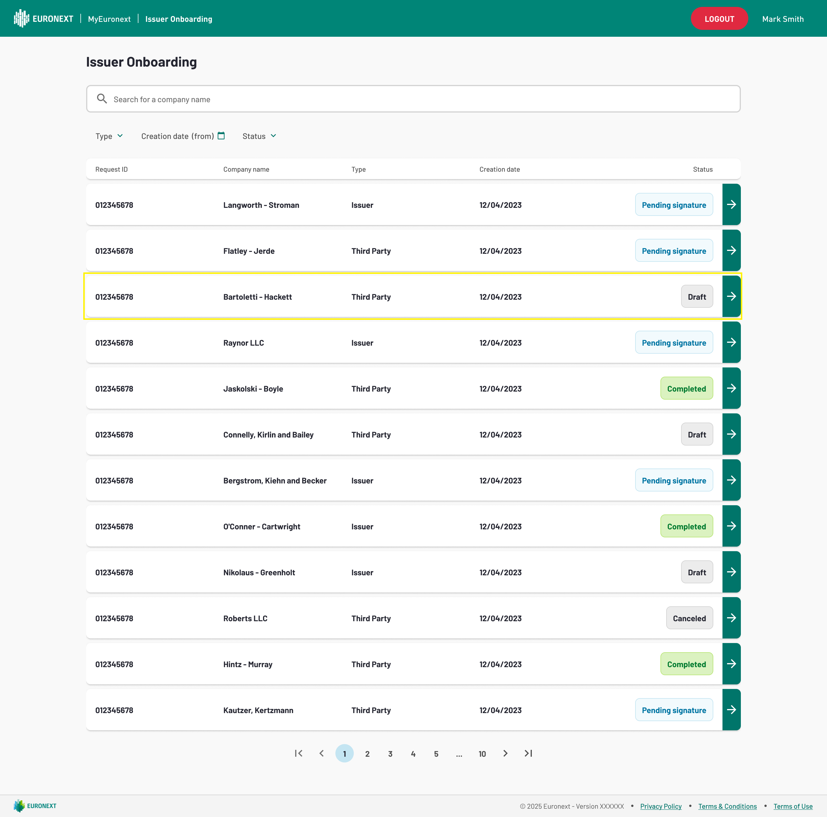 As soon as the Onboarding request is created by Euronext, then you logging in on MyENX Issuer Onboardings' Request list, as a prospect user, and you will be able to see all the Onboarding request (completed or ongoing) on ongoing, based on the perimeter of your user role: