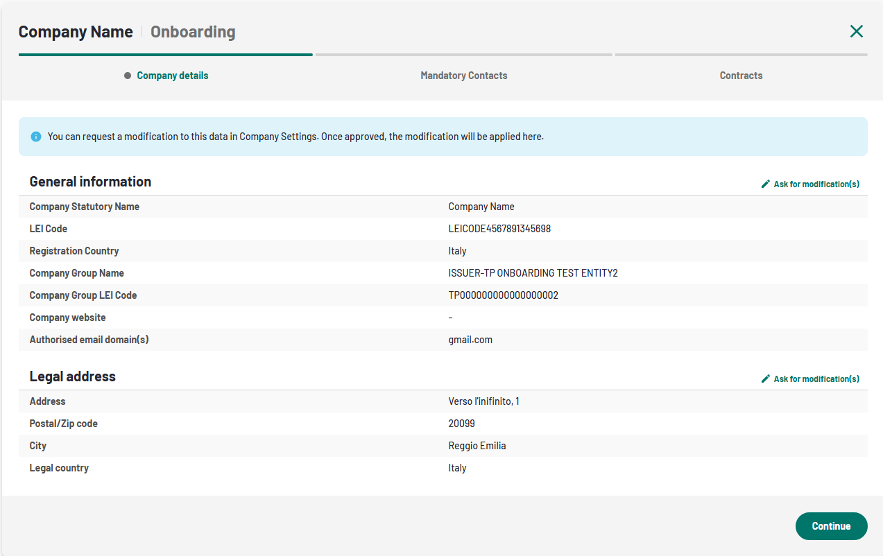 Click on "Ask for modification(s)", available next to each information category. By doing so, the prospectus user will be redirected to Company settings, from where he can manage updates to the relevant legal entity information. Please note that any modification to existing data is subject to Euronext approval. The onboarding process will be paused until approval is granted.