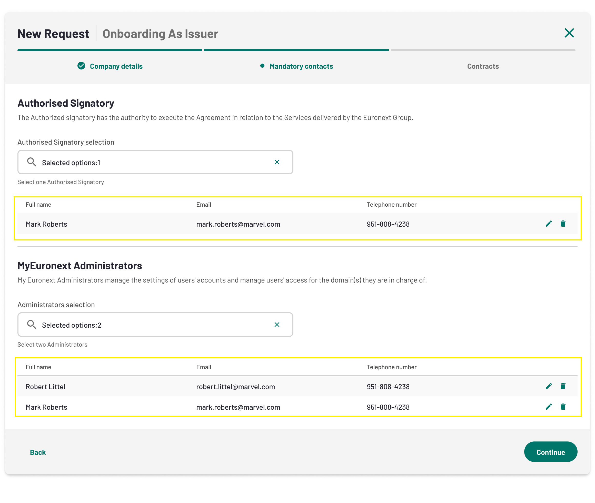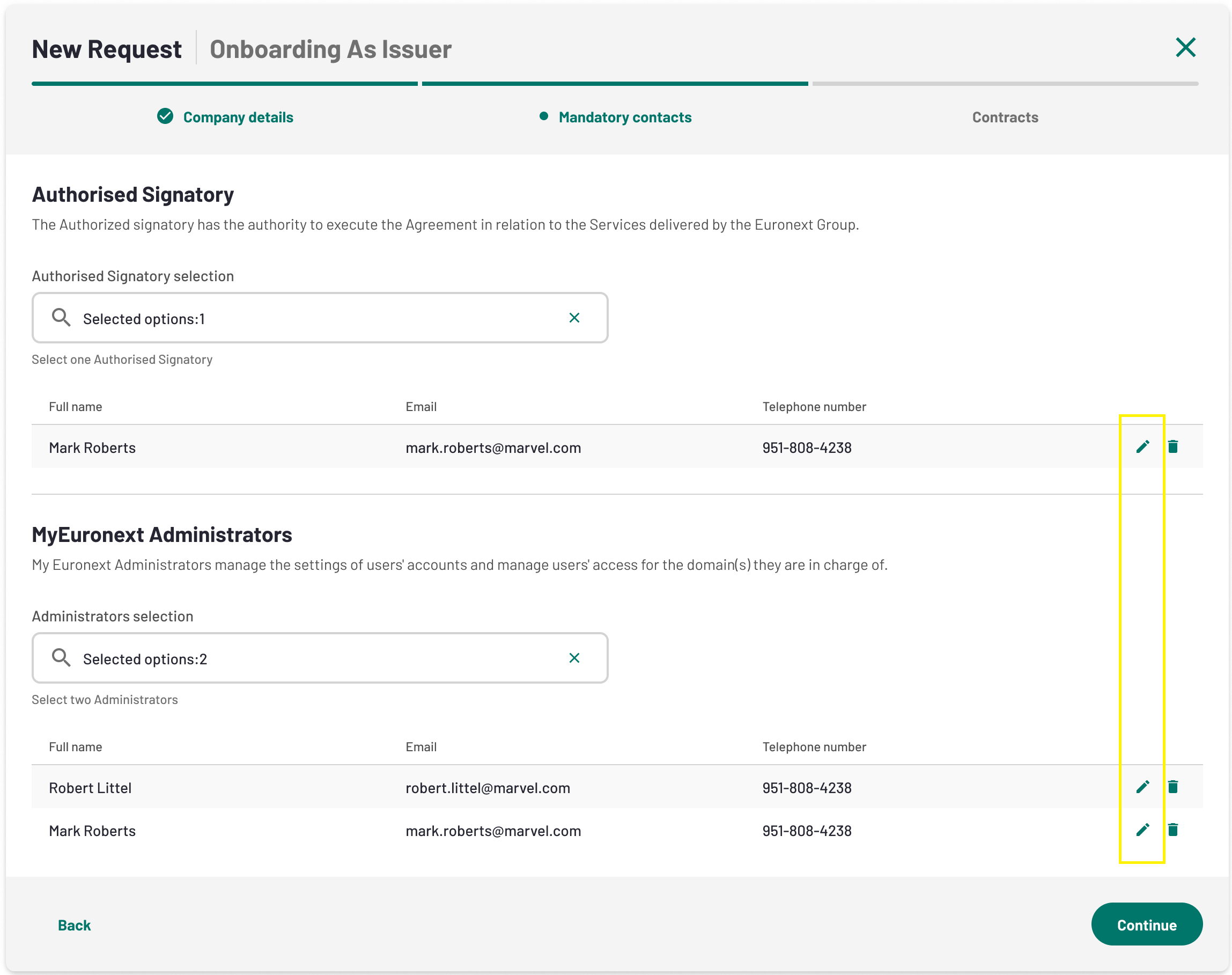 In this status, is still possible to amend the request, in all the steps (Company details, Mandatory contacts and Contracts). After the submission, the request will move again to "Pending approval", waiting for Euronext to approve.