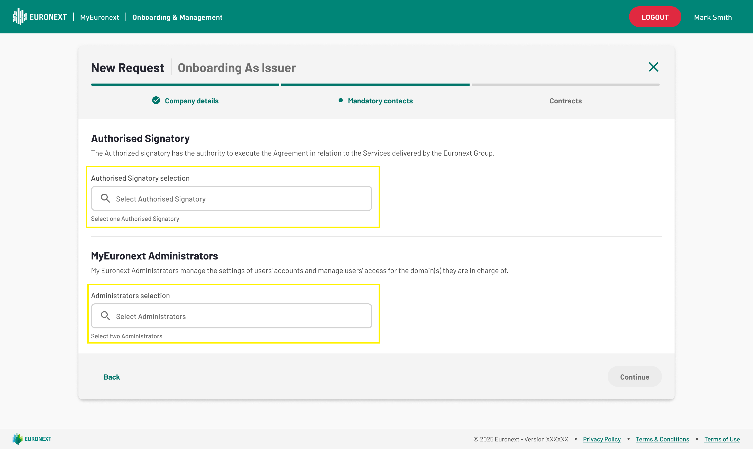 From this section the prospect user must define the Authorised Signatory, and the MyEuronext Administrators.