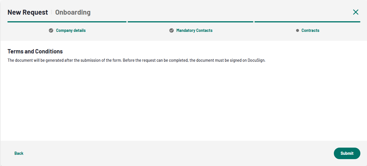As third step you will find the "Contract" section. This page displays the status of the MyEuronext Terms & Conditions document signature. The document is generated after submission, and the company’s authorized signatory will receive an email notification requesting their signature before the request can be approved by Euronext.