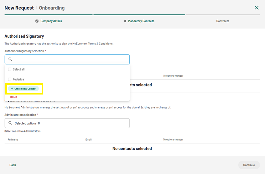 If you can't find the Authorised signatory or the MyEuronext Administrator you want to appoint, from the suggested contacts available in the dropdown lists, you can click on "Create new Contact".