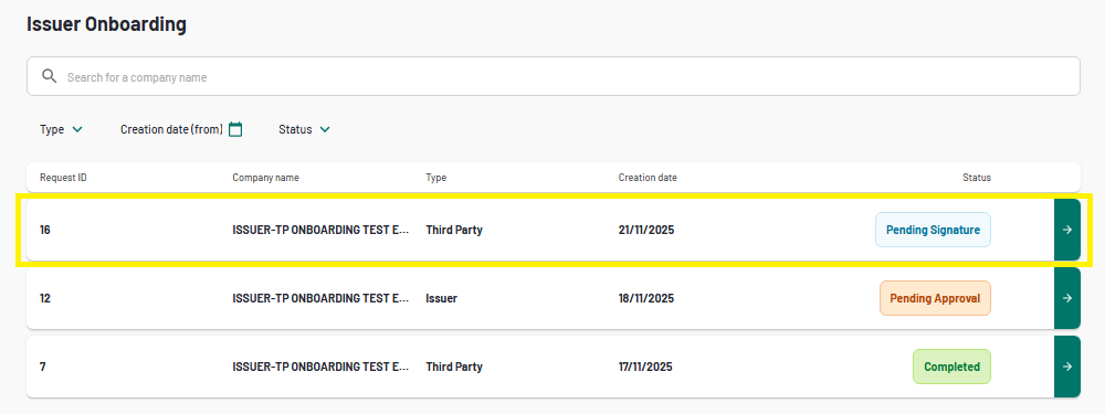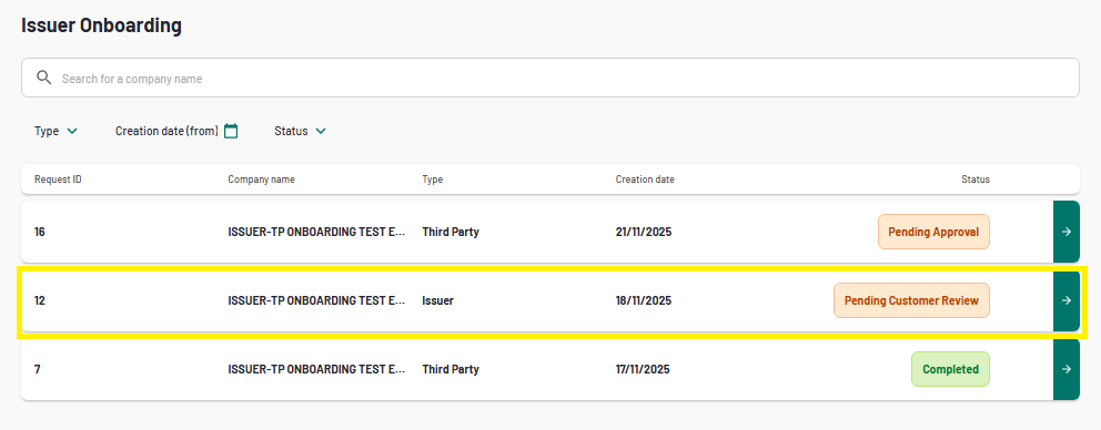 Throughout the process, the onboarding request will change status according to each step. Below is the complete list of all the statuses that a single issuer onboarding request can reach.