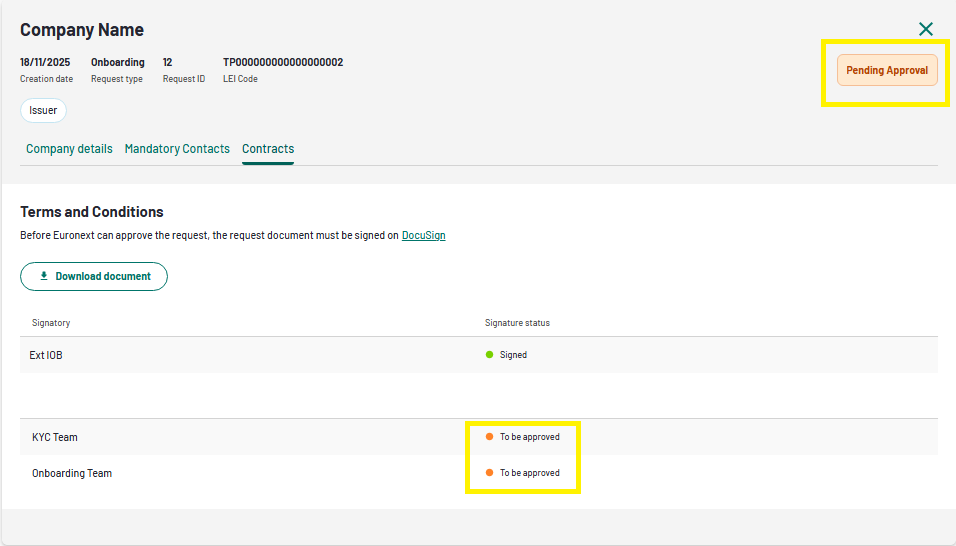 When the Terms & Conditions is signed, the request status will turns to "Pending Approval". From the Contracts tab, you will be able to see the approval tatus on Euronext's side, which will remail "To be approved" until the application is either approved or rejected by all the relevant Euronext approvers. .